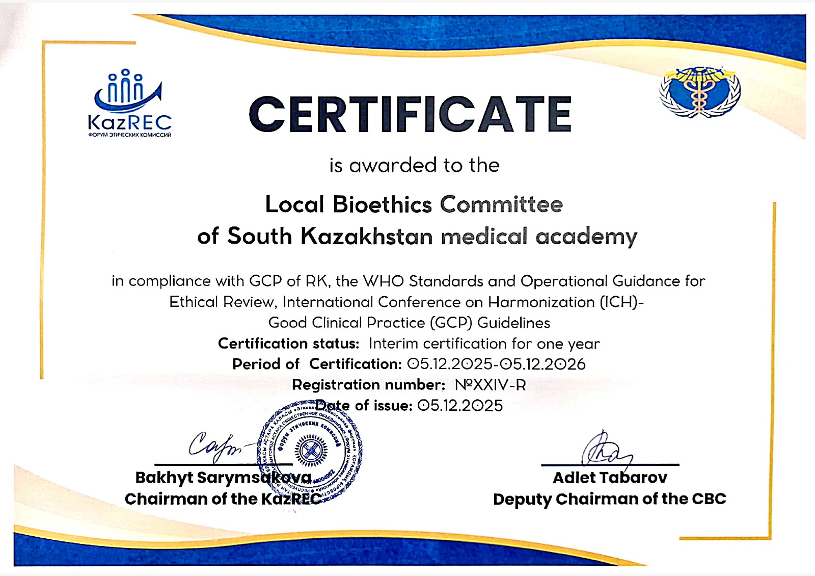 LCB is guided within its activities by: the Constitution of the Republic of Kazakhstan, the Code of the Republic of Kazakhstan “On People’s Health and the Health Care System”, the State Standards of the Republic of Kazakhstan “Good Laboratory Practice”, “Good Clinical Practice”, the Helsinki Declaration of the World Medical Organization, the Council of Europe Convention on Human Rights and Biomedicine , Recommendations of the World Health Organization by the ethics committee conducting an examination of biomedical research, the European Convention for the Protection of Vertebrate Rights those used for experimental and other scientific purposes, Other regulatory legal acts of the Republic of Kazakhstan in the field of regulation of clinical trials and international declarations and guidelines in the field of research ethics (WHO, ICH-GCP, UNESCO, CIOMS, CE); Regulation on the local bioethics commission.