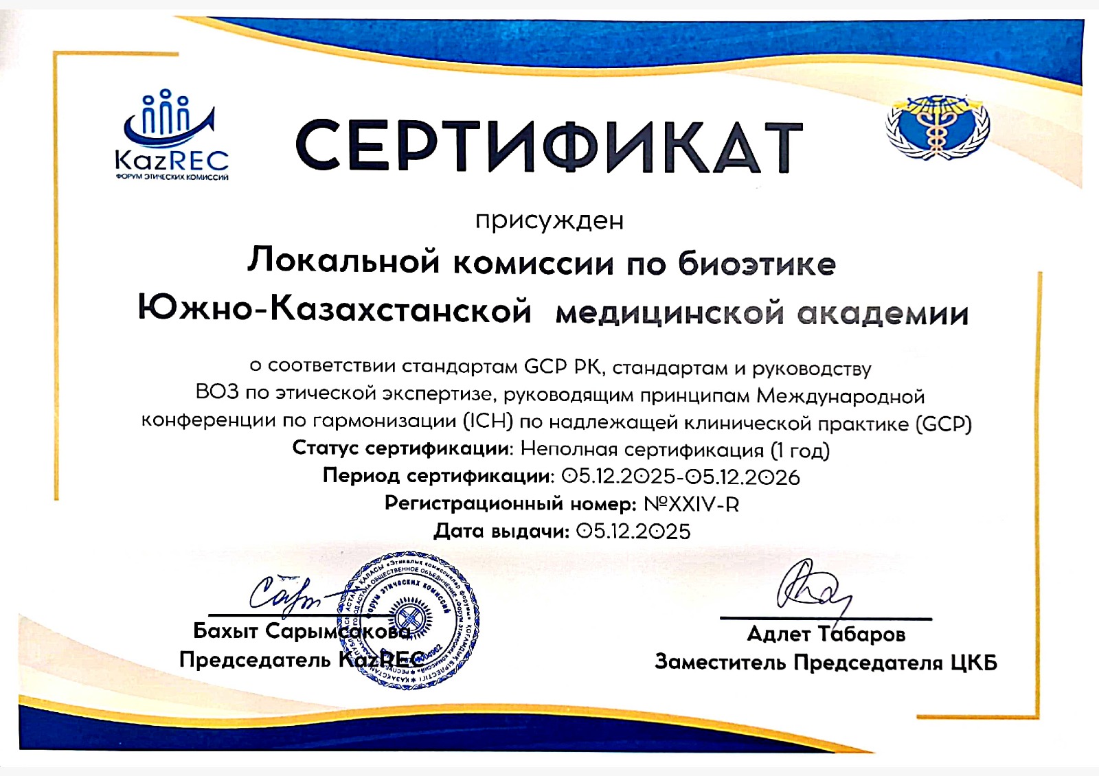 "Биоэтика жөніндегі жергілікті комиссияның" төрағасы, "Оңтүстік Қазақстан медицина академиясы" АҚ "отбасылық медицина" кафедрасының меңгерушісі, медицина ғылымдарының кандидаты, қауымдастырылған профессор