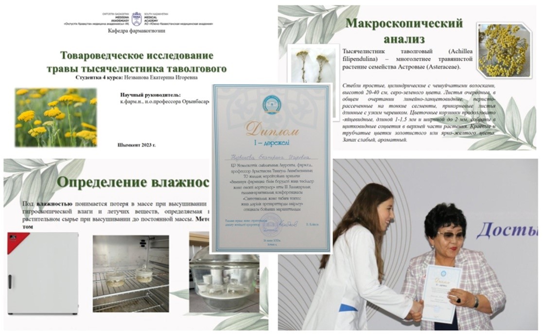 No less interesting and worthy were the report of student Nezvanova K. “Commodity research of the herb Meadowsweet yarrow” and the report of doctoral student Musabekov Zh. “High-performance liquid chromatography in the chemical toxicological analysis of amlodipine”, which were awarded the 1nd and 2nd prize.