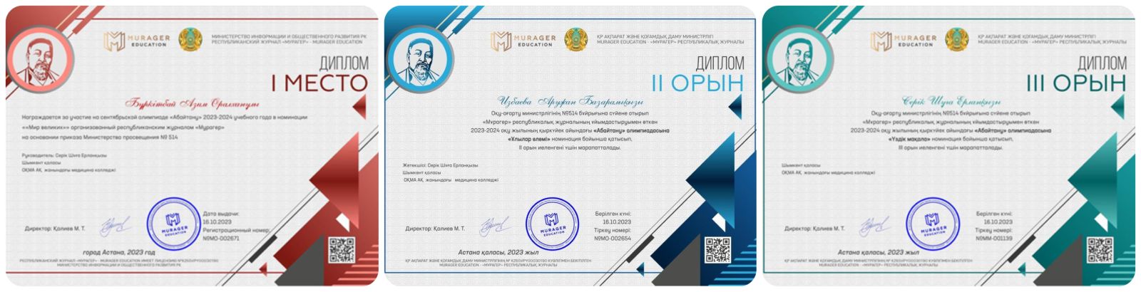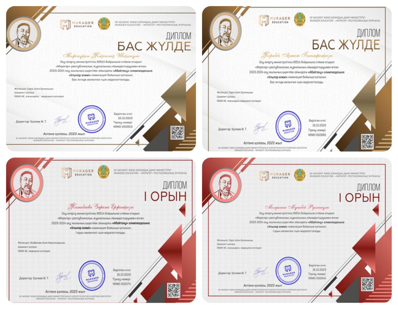 We get to know Abai’s poetic personality, soul, and dream through his poetry. The creative heritage of the great Abai is the spiritual treasury of our people, which has not erased its significance over the centuries. The word Abai is a talisman for the Kazakhs. Feeling that the main goal of the teacher is to popularize students' poems, words filled with initiatives of high inspiration, teachers of the department of general education disciplines of the Medical College at JSC SKMA took part in the republican distance Olympiad among teachers and students "Abaitanu", organized by the scientific and methodological magazine "Murager" in September 2023-2024 academic year and took part in the following nominations and took places: