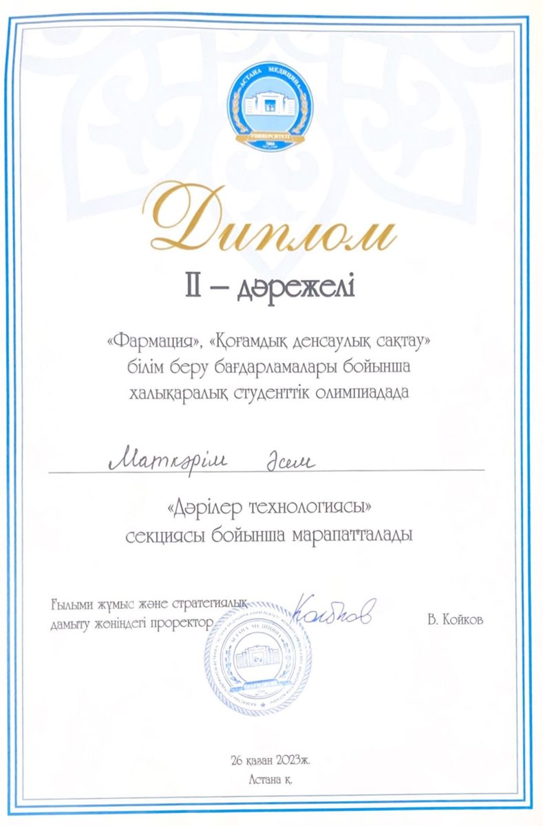 From 25.10 to 26.10.2023, during the International Student Olympiad organized within the walls of Astana Medical University under the educational program "Pharmacy", "Public Health", a 5th-year student of the YUKMA Matkarim Asem was awarded a diploma of the II degree in the section "Technology of Medicines"!